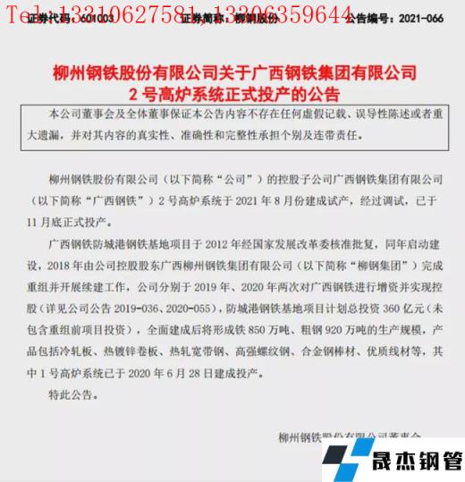 柳钢股份12月7日晚间公告,控股子公司广西钢铁集团有限公司2号高炉系统于2021年8月份建成试产,经过调试,已于11月底正式投产。