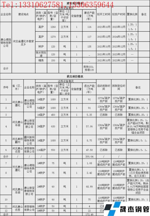 唐山港陆钢铁有限公司退出1080m³高炉2座、退出产能182万吨;75t转炉2座,退出产能3.5万吨/年;唐山新宝泰钢铁有限公司450m³高炉1座,退出产能5.25万吨/年;630m³高炉1座,退出产能57.06万吨/年;60t转炉2座,退出产能143.99万吨/年;霸州新利钢铁有限公司1080m³高炉1座,退出产能8.75万吨/年;津西钢铁有限公司退出550m³高炉1座,退出产能47.58万吨/年;50t转炉2座,退出产能26万吨/年。共计退出炼铁产能300.64万吨,炼钢产能173.49万吨,所有项目将于新建项目建成投产前拆除。