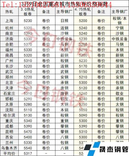 截至3月9日,全国主要城市3.0热轧板卷均价5317元/吨,周环比上涨64元/吨;4.75热轧板卷均价5241元/吨,周环比上涨63元/吨。以下为3月4日与3月9日全国重点城市热轧板卷价格指数对比情况:
