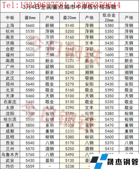 截至3月9日,全国主要城市普8mm中厚板均价5609元/吨,周环比上涨50元/吨;普20mm中厚板均价5290元/吨,周环比上涨52元/吨;低合金20mm均价5492元/吨,周环比上涨53元/吨。以下为3月4日与3月9日全国重点城市中厚板价格指数对比情况: