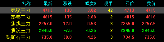 今日螺纹主力期货涨138,收报4713,涨幅3.02%;热卷主力涨135,收报4815,涨幅2.88%;焦煤主力涨12,收报2257,涨幅0.53%;焦炭主力跌7.5,收报2946,跌幅0.25%;铁矿石主力涨30收报735,涨幅4.26%。