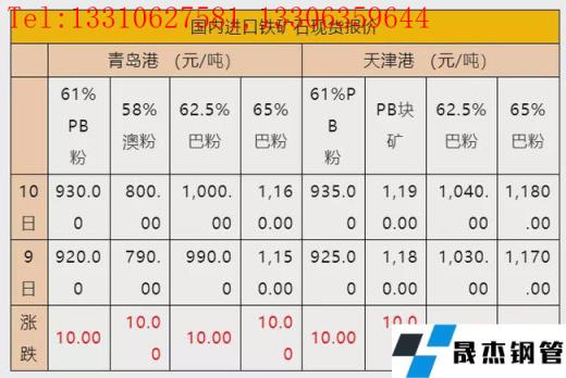 2月10日,青岛港铁矿石现货价格普遍上涨,61%PB粉矿上涨10收930元/吨,58%澳粉上涨10收800元/吨,62.5%巴粉上涨10收1000元/吨,65%巴粉上涨10收1160元/吨;天津港铁矿石现货价格也普遍上涨,61%PB粉矿上涨10收935元/吨,PB块矿上涨10收1190元/吨,62.5%巴粉上涨10收1040元/吨,65%巴粉上涨10收1180元/吨。