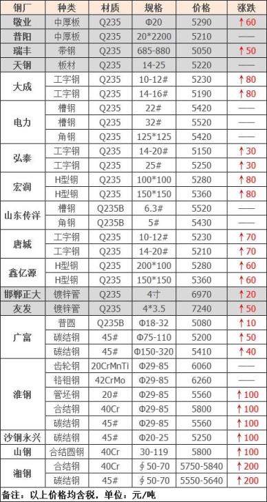 今日板、型、管、特钢共18家91视频APP黄色调价发布,其中: