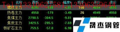 今日螺纹主力期货跌199,收报4695,跌幅4.07%;热卷主力跌179,收报4950,跌幅3.49%;焦煤主力跌304.5,收报2798.5,跌幅9.81%;焦炭主力跌285.5,收报3429.5,跌幅7.69%;铁矿石主力跌57,收报759.5,跌幅6.98%。