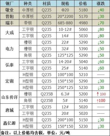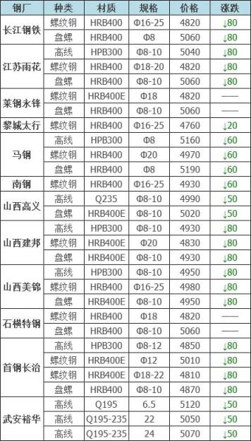 15日广东河源德润钢铁到厂跌30:钢筋切粒3460;边角料,新钢板料3430;纯钢筋头,直钢筋3410;模具钢、料头圆钢、轨道钢、火车轮3410;硅钢片停收;冷轧、热轧、碎料冲子3360;优重3410;锻打料、马蹄铁3410;重废3360;机械生铁、高碳钢、铸钢件、生熟混装3360厚剪3310不含税