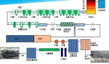 加热炉、高压水除鳞、轧机、轮廓仪或测径仪、剪或锯、热打印机、冷床、矫直机、编组台架、码垛台架、打捆机、称重设备、喷标等设备