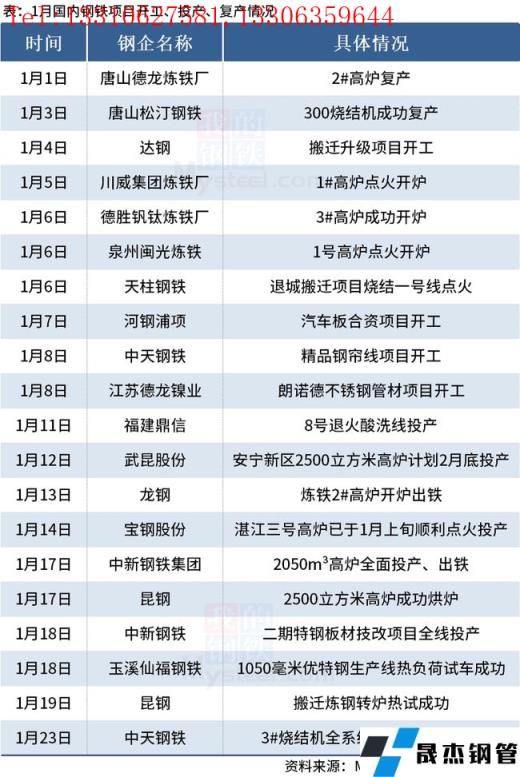 据不完全整理,2022年1月国内20个钢铁项目开工、投产和复产。其中,达钢、河钢浦项、中天钢铁和江苏德龙镍业等4个钢铁相关项目开工;唐山德龙炼铁厂和唐山松汀钢铁项目复产;福建鼎信、宝钢股份、中新钢铁和武昆股份等钢铁项目投产。具体内容如下: