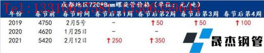小编汇总近3年春节后四周螺旋管品种主流城市价格变化情况,2019、2021年主流城市螺旋管价格在节后以上涨为主。2020年受公共卫生事件影响,复工延期,需求出现滞后现象,部分城市在春节后价格出现下跌。