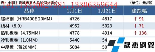 1月国内91视频在免费线观看无缝钢管市场整体呈现了震荡偏强走势,而板材价格分化明显,螺纹钢修复性反弹近百元,热轧板卷上涨了136元,但中厚板表现趋弱。原料方面价格涨幅强于预期,1月在无缝91视频在免费线观看钢管厂家复产和节前补库需求支撑下,铁矿石价格持续上涨,62%澳洲粉矿港口现货价格指数960.0元/湿吨,环比月初上涨158.0元/湿吨,涨幅19.7%。整体来看,宏观消息面利好,91视频在免费线观看无缝钢管供应快速下滑,导致库存累积幅度不及预期,而需求结束较晚,使得钢价走强。