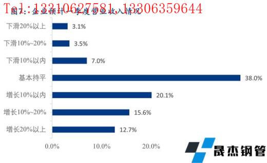 3、对于一季度营业收入的情况,38.0%的企业预计一季度营业收入与去年同期基本持平,48.3%的企业预计一季度营业收入与去年同期相比有所增长,13.6%的企业一季度营业收入同比下降,其中预计一季度营业收入增幅20%以上及降幅20%以上的企业分别占比12.7%和3.1%。