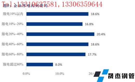 4、对于限电方面的调研结果显示,22.0%的样本企业明确表示目前存在限电的情况,限电的比例较为平均,35.4%的样本企业限电比例在20%以内,38.9%的样本企业限电比例在20%-60%,25.7%的样本企业限电比例在60%以上。