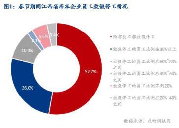 据调研,春节期间江西省样本企业所有员工都放假停工的企业占调研样本比例为52.7%,放假停工的员工比例不到20%的企业仅占比5.5%;放假停工的员工比例在60%以上的企业样本占比达到89%。