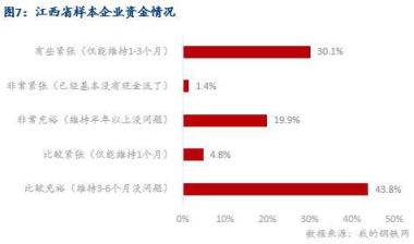 4、调研企业资金情况发现:从企业当前现金流情况来看,据调研,63.7%的样本企业资金流是比较或者非常充裕的,30.1%的样本企业资金有些紧张,仅能维持1-3个月,而资金压力比较及非常紧张的样本企业占比6.2%。