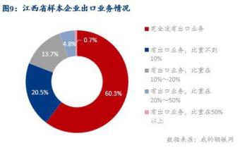 据调研,61%的样本企业没有出口业务,39 %的样本企业有出口业务,出口业务比重大多集中在10%以内。