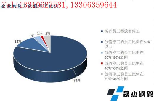 5、样本企业员工放假停工比例:所有员工都停工放假的企业占比78.65%;放假停工的员工比例在80%以上的企业占比11.24%;放假停工的员工比例在60%~80%的企业占比8%;放假停工的员工比例在40%~60%的企业占比1.12%,放假停工的员工比例在20%~40%的企业占比3.37%,放假停工的员工比例不到20%的企业占比2.25%。