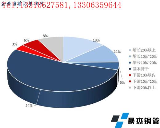 8、样本企业当前订单状况:增长20%以上的企业占比13.48%,增长10-20%的企业占比11.24%;增长10%以内的企业占比4.49%;基本持平的企业占比53.93%;下滑10%以内的企业占比3.37%;下滑10-20%的企业占比5.62%;下滑20%以上的企业占比7.87%。