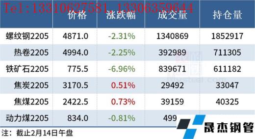 2022年02月14日午报:钢价多数下跌,铁矿石期货跌逾6%