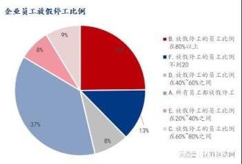 调研企业样本中,放假停工的员工比例在20%~40%之间占比7.76%,放假停工的员工比例在40%~60%之间占比 8.65%;放假停工的员工比例在60%~80%之间占比8.65%;放假停工的员工比例不到20%占比12.86%;放假停工的员工比例在80%以上占比24.83%;所有员工都放假停工占比37.25%。