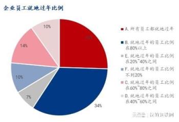 调研企业样本中,所有员工都就地过年占比25.50%,就地过年的员工比例在80%以上占比33.70%,就地过年的员工比例在60%~80%之间占比13.75%,就地过年的员工比例在40%~60%之间占比9.76%,就地过年的员工比例在20%~40%之间占比7.10%,就地过年的员工比例不到20%占比10.20%。