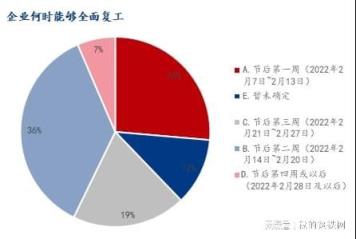 调研企业样本中,对于全面复工的时间,节后第一周(2022年2月7日~2月13日)占比26.37%,节后第二周(2022年2月14日~2月20日)占比36.32%,节后第三周(2022年2月21日~2月27日)占比19.40%,节后第四周或以后(2022年2月28日及以后)占比6.47%,暂未确定占比11.44%。