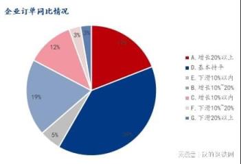2、与去年同期相比,企业订单增长的占比49.89%,持平的占比39.25%,下滑的占比10.86%。企业订单情况增长的较多,形势较为良好。