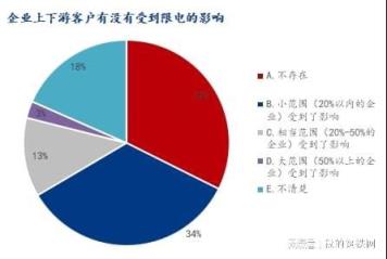 关于企业的上下游客户有没有受到限电的影响,参与调研企业中表示不存在占比32.37%,小范围(20%以内的企业)受到了影响占比34.15%,相当范围(20%-50%的企业)受到了影响占比12.42%,大范围(50%以上的企业)受到了影响占比2.66%,不清楚占比18.40%。可见还是有相当一部分企业受到了限电影响。