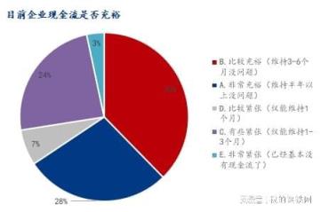 目前企业的现金流是否充裕,参与调研企业中表示比较充裕(维持3-6个月没问题)占比37.69%,非常充裕(维持半年以上没问题)占比27.94%,比较紧张(仅能维持1个月)占比6.87%,有些紧张(仅能维持1-3个月)占比24.17%,非常紧张(已经基本没有现金流了)占比3.33%。