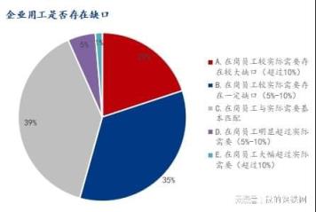 3、对比实际经营需要,54.32%企业表示在岗员工比实际需要存在缺口,39.02%企业表示在岗员工与实际需要基本匹配,仅有6.65%在岗员工超过实际需要。