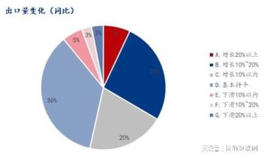 与去年同期相比,关于今年的出口量变化,在有出口业务的样本中53.48%企业表示出口有增长,35.65%企业表示基本持平,10.87%企业出口下滑。具体来看增长20%以上占比6.96%,增长10%~20%占比26.52%,增长10%以内占比20.00%,基本持平占比35.65%,下滑10%以内占比5.22%,下滑10%~20%占比2.61%,下滑20%以上占比3.04%。