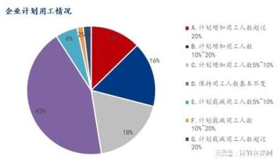 4、对于企业计划用工情况,参与调研企业中47.45%企业计划增加用工人数,43.46%企业保持基本不变,9.09%的企业计划裁减用工人数。