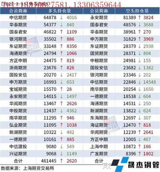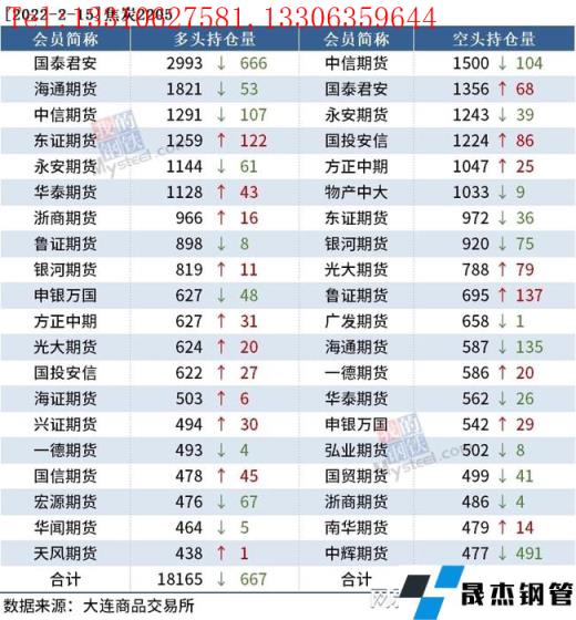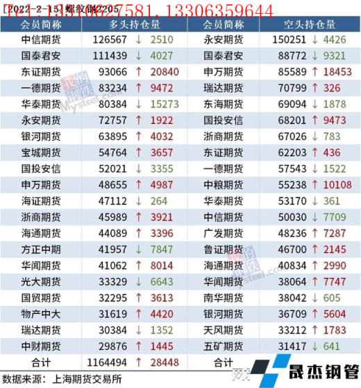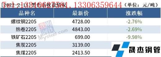 截至2月15日收盘,螺纹钢2205收4728元/吨,跌2.76%;热卷2205收4843元/吨,跌2.69%;铁矿石2205收699元/吨,跌9.98%。