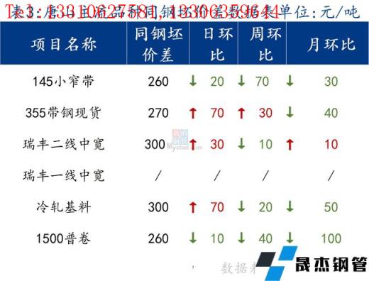 145带钢与钢坯价差小幅收窄,焊管与355带钢价差收窄。热卷与带钢价差缩小,价格基本持平。
