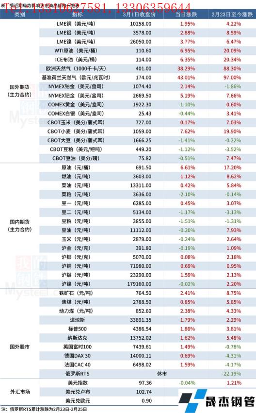 近期,受国际局势影响,全球金融及大宗商品市场出现较大波动。3月2日,多个大宗商品价格创多年新高,天然气累计涨幅超80%,原油突破110美金。汇总情况如下: