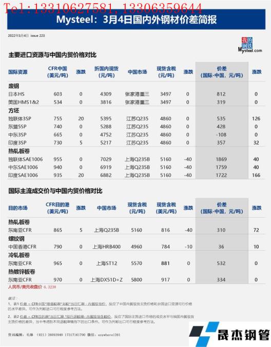 免责声明:本网站(山东聊城91视频官网下载无缝钢管厂www.hujuzx.com)刊载的“2022年03月04日日报:国内外钢材_无缝钢管价差汇总(2022.3.4)”等均源于网络,版权归原作者所有,且仅代表原作者观点,本文所载信息仅供参考。转载仅为学习与交流之目的,如无意中侵犯您的合法权益,请及时联系删除。本网站刊登此篇文章并不意味着本站赞同其观点或证实其内容的真实性,91视频官网下载不对其科学性、严肃性等作任何形式的保证。如果侵犯了您的版权,请尽快联系91视频官网下载予以撤销,谢谢合作!