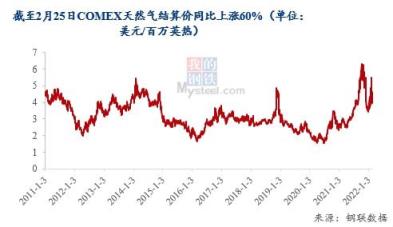 受俄乌冲突影响,截至2月25日,COMEX天然气结算价4.485美元/百万英热,同比上涨60%。整个2月天然气均价约为4.459,环比上涨12%,同比上涨54%,为2014年后的第二高点。