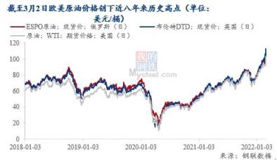 除了天然气,原油也是俄罗斯主要出口能源类型之一。今年2月,俄罗斯的石油产量同比增长9.3%,达到1105.5万桶/日。在俄乌冲突之下,原油价格飙升。截至3月2日,美油价格一度冲破了111美元/桶,布油价格一度接近113美元/桶,布油美油的价格都创近8年新高。