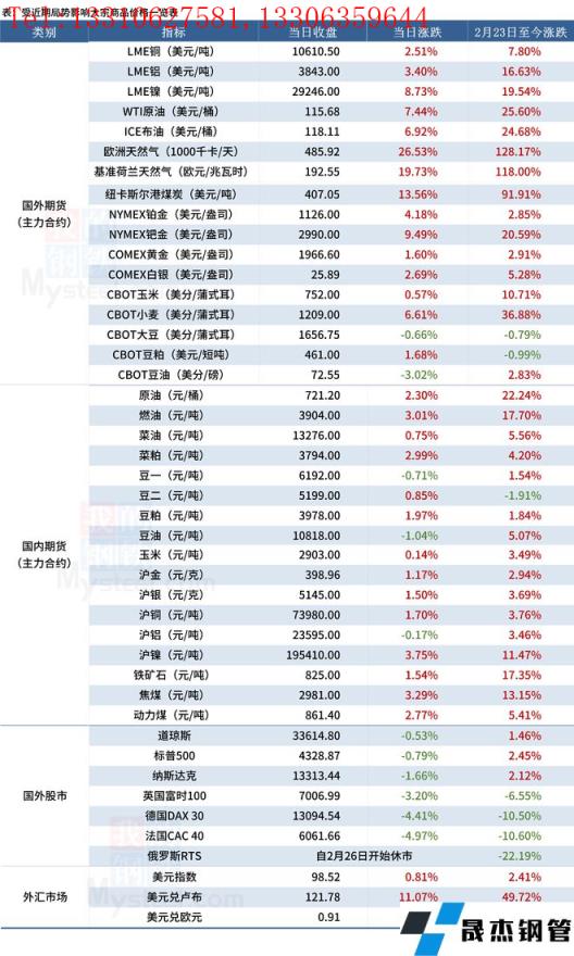 近期,受国际局势影响,全球金融及大宗商品市场出现较大波动。3月4日,欧美股市经历“黑色星期五”,国际油价、天然气大幅上涨,油价本周波动幅度创历史新高。汇总情况如下: