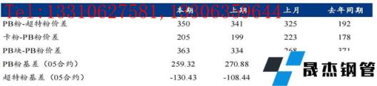品种方面来看,表现突出的有粉块价差及中低品价差,本期PB粉块价差为365元/吨,环比扩大44元/吨。PB粉与超特粉的价差358元/吨,环比扩大39元/吨。近期低品中出了杨迪粉外,其他低品需求较弱,涨幅远低于中高品,价差拉大。
