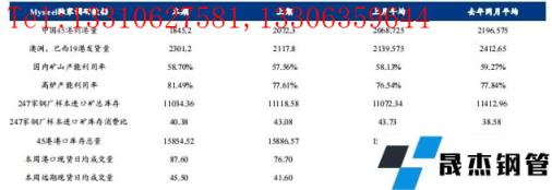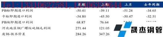 利润方面:截至周五,青岛港PB粉即期进口利润-50.41元/吨,环比下降11.3元/吨;青岛港卡粉即期进口利润-54.8元/吨,环比下降9.3元/吨;青岛港PB块即期进口利润68.87元/吨,环比下降7.76元/吨。本期河北地区无缝91视频在免费线观看钢管厂家螺纹吨钢毛利润271.44元/吨,环比增加150.4元/吨,废钢与铁水价差284.26元/吨,环比收窄63元/吨。