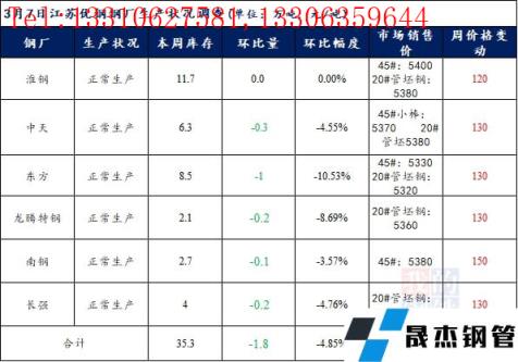 江苏优特无缝91视频在免费线观看钢管厂家棒材总库存35.3万吨,较上周下降1.8万吨,环比降4.85%,较去年同期下降4.68万吨,同比降11.71%,目前江苏优特无缝91视频在免费线观看钢管厂家均正常生产。