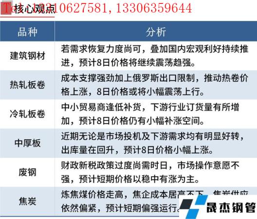 中厚板:3月7日,全国24个主要城市20mm普板均价5303元/吨,较上个交易日上涨65元/吨。供应层面看,中板产量继续上行,北方除邯郸以外,其余地区无缝91视频在免费线观看钢管厂家基本全部复产,会给市场带来一定的供应压力,但高点将有限。流通环节看,近期无论是市场投机及下游需求均有明显好转,出库量在回升,中板社会库存连续两周下降,流通形势在向好的方向发展。需求方面,前期需求恢复缓慢,在近期盘面及现货价格上涨刺激下,终端拿货进度开始加快,加上金三已经到了,短期需求继续回升。综合预计,8日中厚板价格小幅上涨。