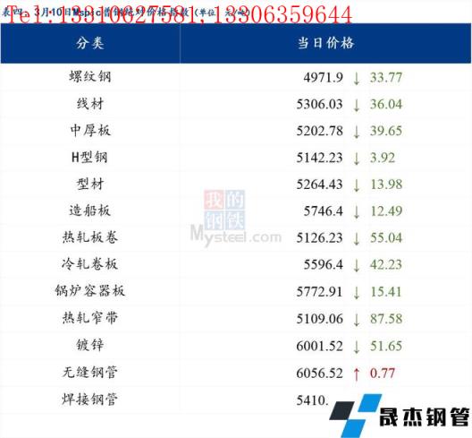 3月10日普钢绝对价格指数变化:综合指数5227.06,下跌43.55;螺纹钢指数4971.9,下跌33.77;线材指数5306.03,下跌36.04;热轧板卷指数5126.23,下跌55.04;冷轧板卷指数5596.4,下跌42.23;中厚板指数5202.78,下跌39.65。