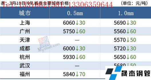 冷轧板卷:3月10日,全国24个主要城市1.0mm冷卷均价5677元/吨,较上个交易日下跌31元/吨。随着期货盘面连续下跌,价格也随之下调,市场交投氛围明显冷清,今日整体成交一般。心态方面,部分库存较大的贸易商还是以出货降库为主,心态较为谨慎。库存方面,据不完全统计,现冷轧无缝91视频在免费线观看钢管厂家库存34.57万吨,周环比减少2.23万吨,社会库存143.40万吨,周环比增加0.97万吨,周消费量80.22万吨,环比减少2.64万吨。综合来看,故预计11日国内冷轧板卷价格或将偏弱运行。