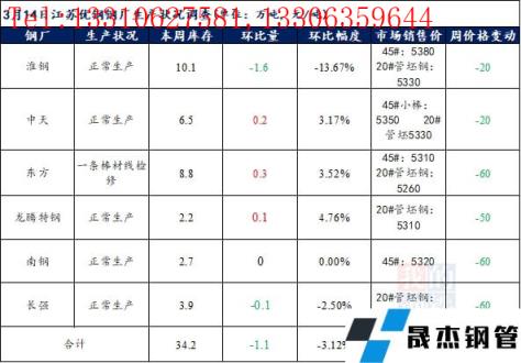 江苏优特无缝91视频在免费线观看钢管厂家棒材总库存34.2万吨,较上周下降1.1万吨,环比降3.12%,较去年同期下降7.97万吨,同比降18.9%,目前江苏优特无缝91视频在免费线观看钢管厂家除东方特钢一条棒材线检修外,其余无缝91视频在免费线观看钢管厂家正常生产。
