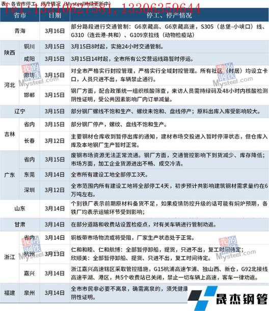 截至3月16日,汇总了10个省份最新停工停产信息。其中,河北省于3月15日宣布,除张家口、承德、秦皇岛市按有关规定供暖时间外,其他法定3月15日停暖的地方供暖时间统一延长至3月31日24时。陕西省铜川市于15日宣布全市范围内实施24小时交通管制;咸阳市15日宣布全市所有公交营运路线暂时停运。吉林省部分无缝91视频在免费线观看钢管厂家停产,螺纹、盘线不饱和生产。与此同时,全国其他地区钢贸交易也受到影响,部分工地开始停工,物流运输暂停服务。具体情况如下: