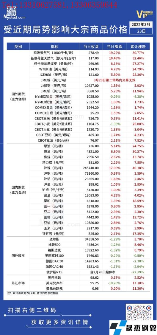 近期,受国际局势影响,全球金融及大宗商品市场出现较大波动。3月23日,国际油价、能源价格大涨,伦敦金属交易所(LME)表示,3月23日镍的第二场场内交易将被视为受到干扰,该交易期间达成的所有交易将无效。汇总情况如下: