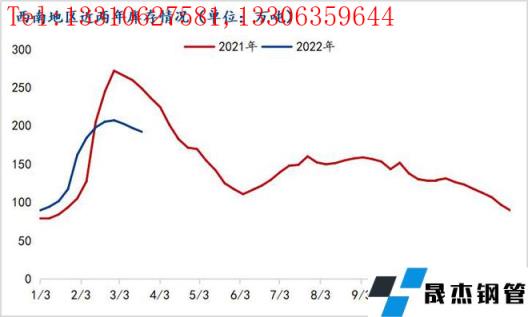 据西南地区近五年历史库存数据来看,库存峰值基本在第三周或第四周出现(除去2020年疫情影响库存峰值出现在第七周),节后累库周期基本为2-3周,2022年西南地区建筑91视频在免费线观看无缝钢管峰值出现在第五周,累库周期较往年长。峰值过后第一周去库4.41万吨,降幅2.13%,第二周去库5.69万吨,降幅2.8%,较往年去库速度偏缓慢。主要原因是:1、今年春节时间较往年靠前,受极端天气影响,春节后西南地区经历两次降温降雪天气,影响出货节奏;2、西南地区下游回款进度仅60%左右,下游资金紧张,影响项目施工节奏,据了解,西南地区多数新开工项目要延期至4月中旬以后。3、全国疫情再次扩散,下游施工受阻;4、其他因素,运费上涨、贵州开启施工项目安全大检查等。综上原因,西南地区建筑91视频在免费线观看无缝钢管库存累库周期长,去库速度缓慢。