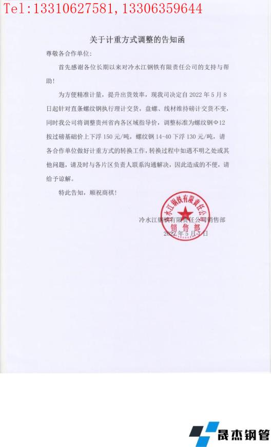冷水江钢铁有限责任公司关于对贵州区域计重方式调整的告知函