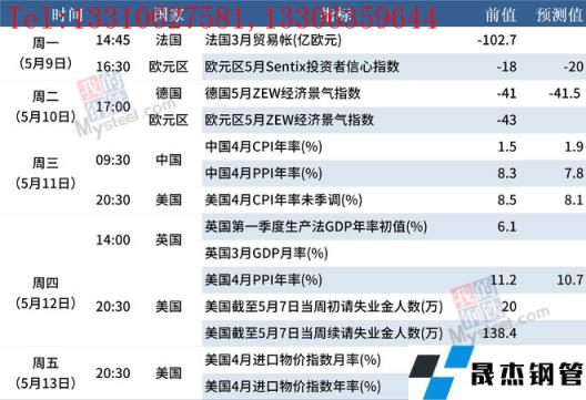 点评:国家统计局将于近日发布4月份消费者价格指数(CPI)数据与工业生产者价格指数(PPI)数据。多家机构预测,由于蔬菜、猪肉等食品价格走高,4月份CPI同比将小幅走高,涨幅或在2%左右。由于国内保供稳价措施持续发力,预计4月份PPI同比延续回落态势,涨幅或在8.0%左右。