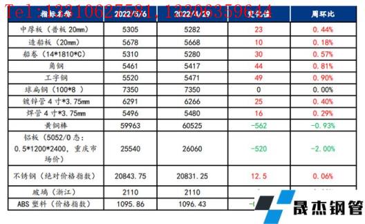 截止2022年5月6日,各原材料当日即时价格以及价格周环比情况如下: